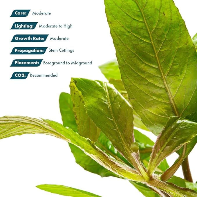 - Care Requirements – Thrives in Moderate to High Light; 8–10 hrs/day – CO₂ Recommended – Propagates via Stem Cuttings – Grows 10–20 cm Tall in Nutrient Substrate with Regular Maintenance.