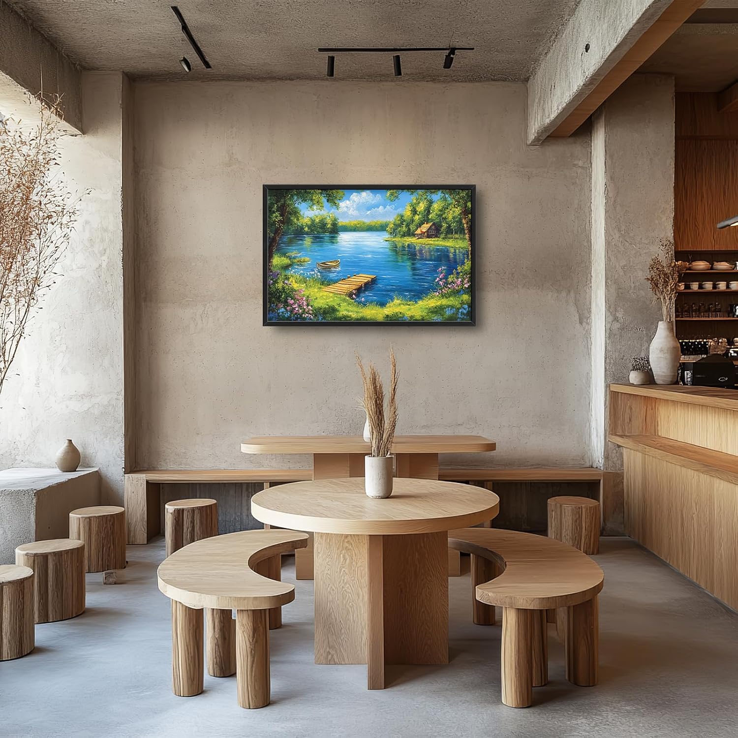 Large Lake Cabin Wall Art for Living Room, Framed Oversized Tree Boat Wildflowers Wall Decor Nature Landscape Canvas Painting Modern Artwork for Bathroom Bedroom Office Dining Room 36"x24"