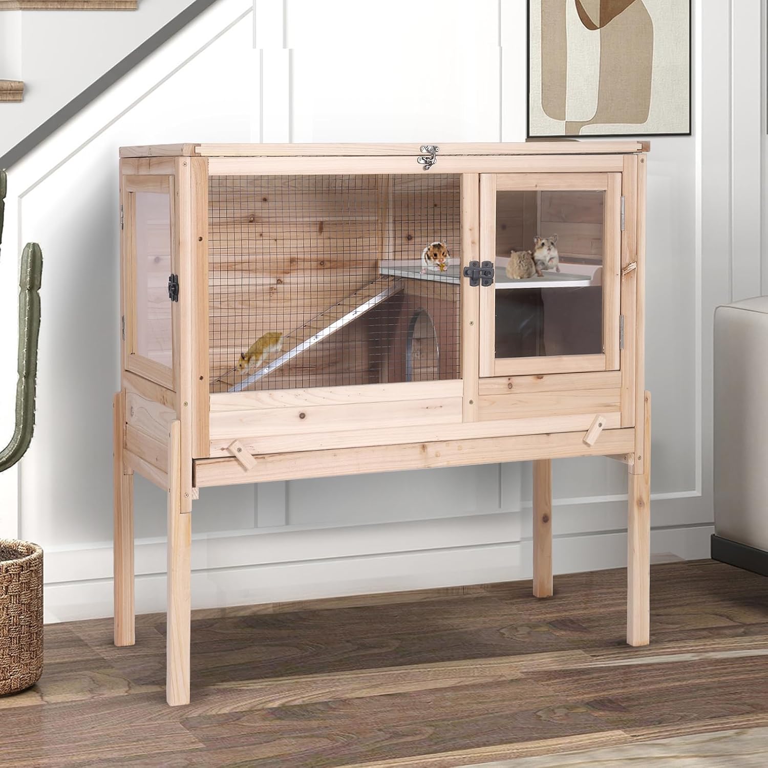 - ANTI CHEWING METAL EDGES Made of solid wood and the ramps, hiding holes and floor frames were reinforced with metal frames to prevent rabbits from gnawing and make the rabbit cages more durable. While being safe and breathable.Give your furry friend a cozy home.