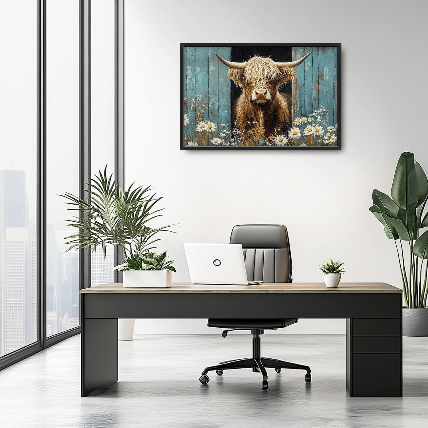 Large Farmhouse Highland Cow Country Wall Art for Living Room, Floral Canvas Oversized Wall Decor, Daisy Flower Animal Framed Pictures Painting Print Artwork for Bedroom Office 36"L x 24"W
