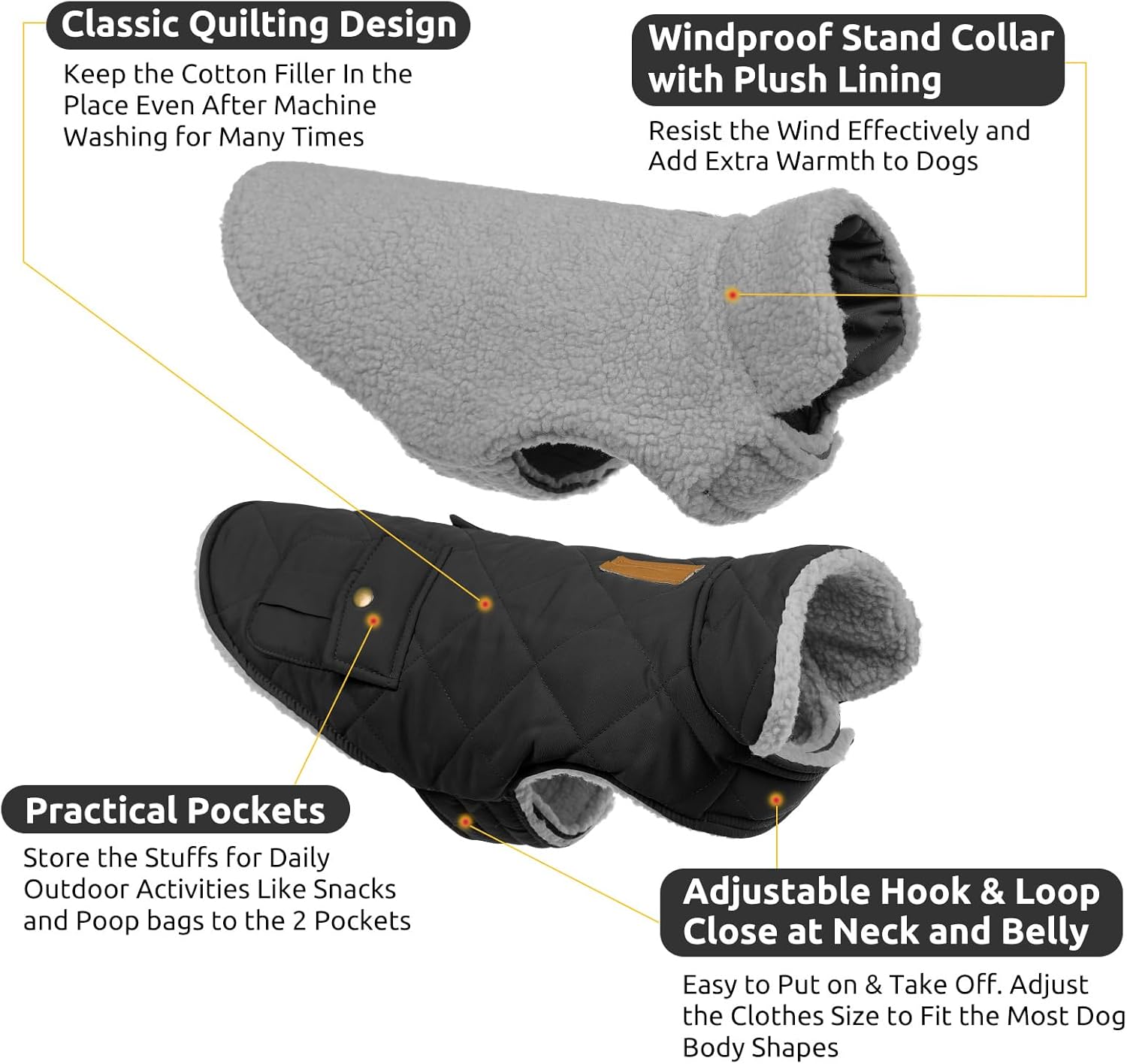 - CUTE STORAGE POCKETS AT THE BACK - The stylish quilting pockets at the back are eye-catching. It is easy to store some snacks, garbage bag or the leash to the storage pockets at the back of the dog jacket.
