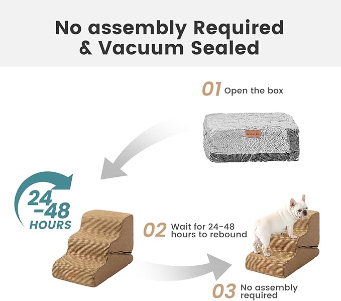 - No Assembly Required: The foam dog stairs for bed is convenient and hassle-free, simply unbox the pet steps, your furry friend can start using it right away. There is a handle on the back of the pet ramp, allowing you to easily move the dog step anywhere, providing convenient stairs for dogs to get on bed. Due to vacuum compression, the surface of the puppy stairs may appear slightly wrinkled, and it will recover within 24-48 hours.