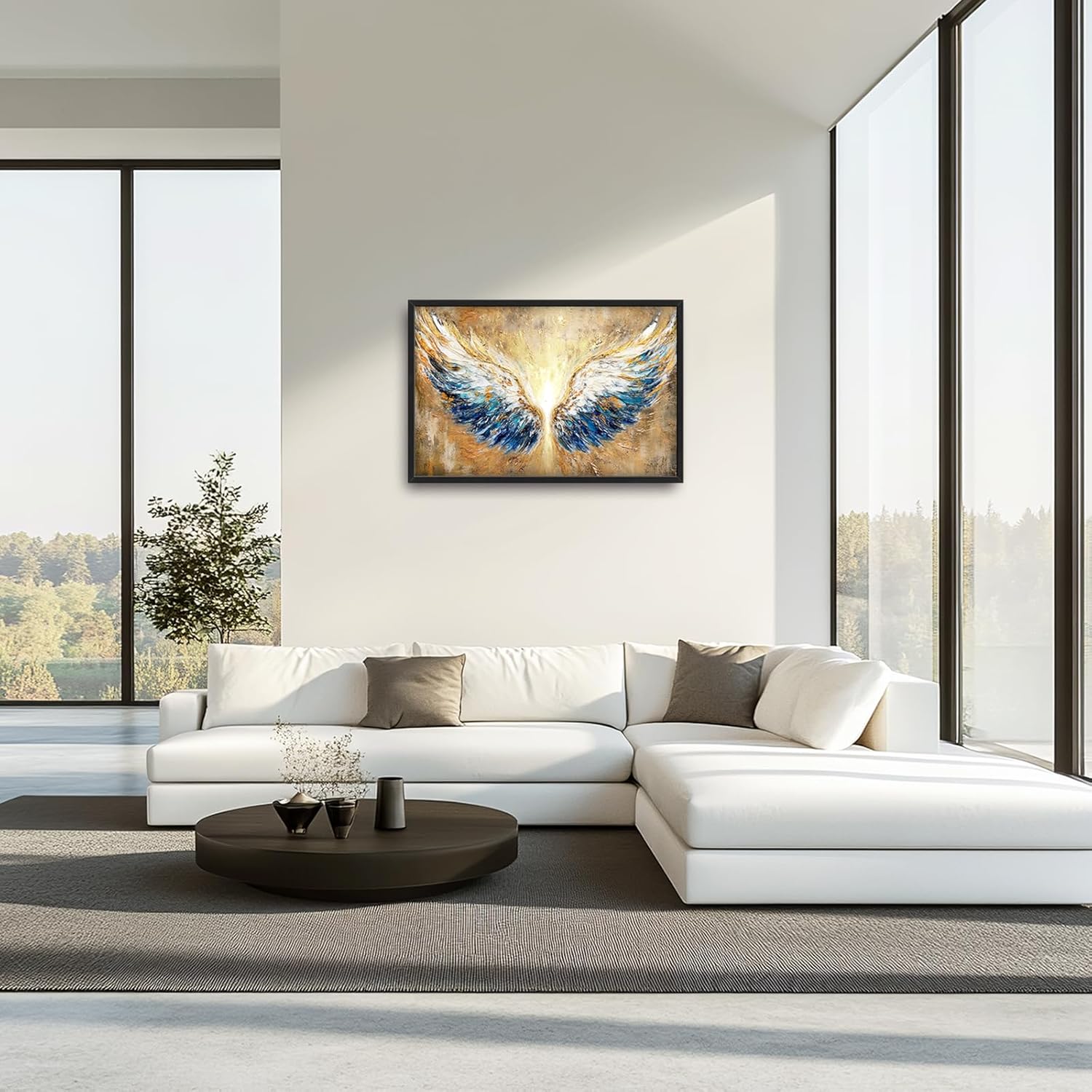 - 【Unique Design】 Abstract oil painting of two large white and blue wings with a golden halo, gold glitter on the background, light shining through the center of each wing, in a gold and beige color palette.