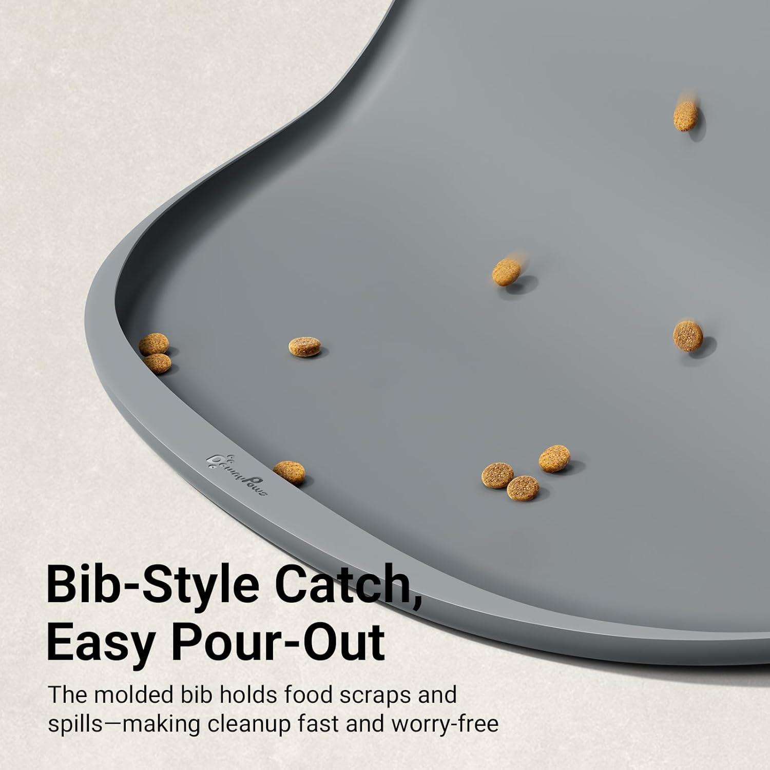 - Unique FurBib Design: Our thoughtful FurBib design helps guide water and crumbs back onto the pet feeding mat when lifted. Less scatter, less cleanup. The small pocket (10mm deep) suits most cat food sizes, while the medium pocket (16mm deep) easily contains common dog kibble