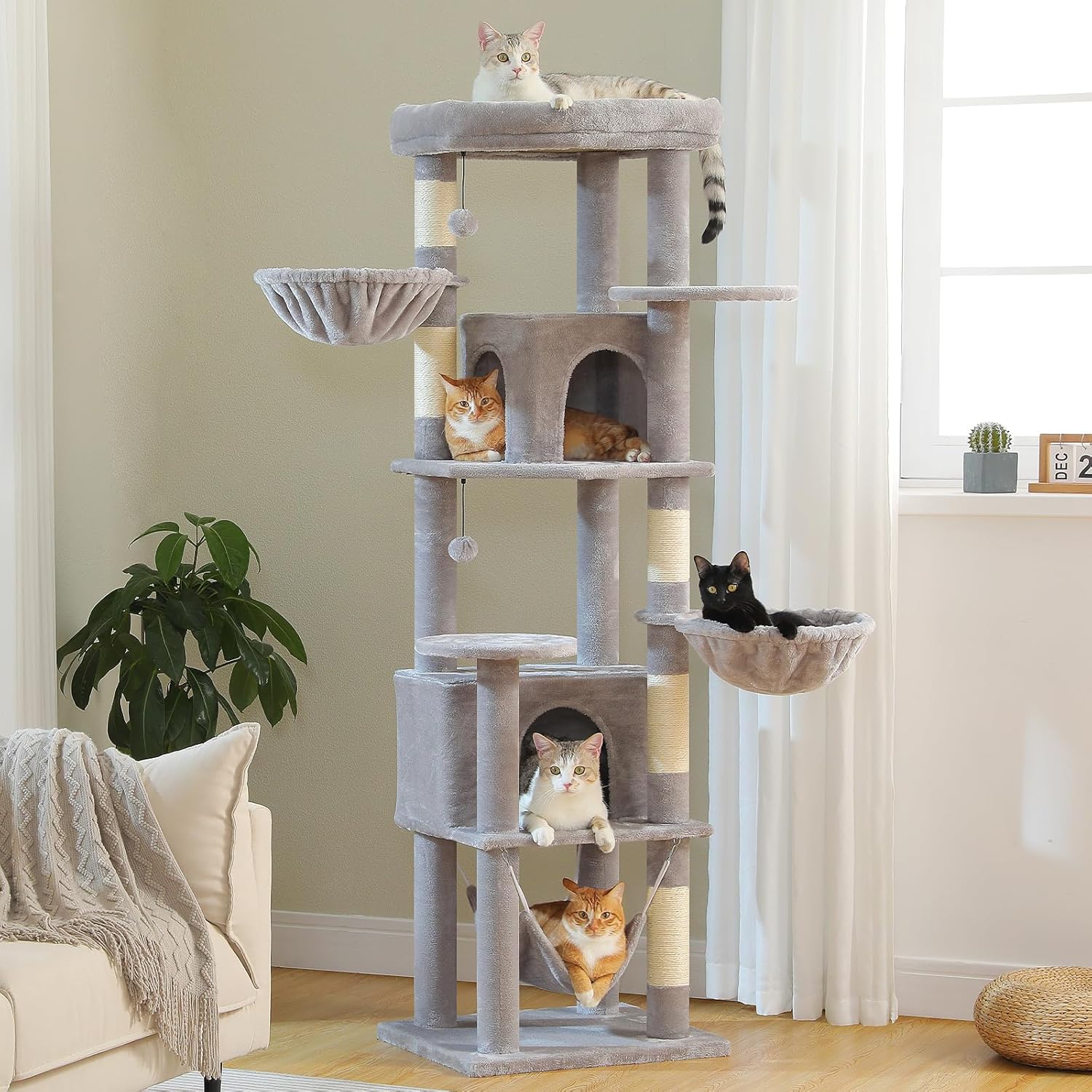 71.2" Tall Cat Tree for Indoor Cats - 9-Level Multi-Cat Tower w/5 Sisal Scratching Posts, 2 Condos, 3 Hammocks, Perch & Pom Poms - Heavy-Duty for Adult Cats, Space-Saving Plush Gray