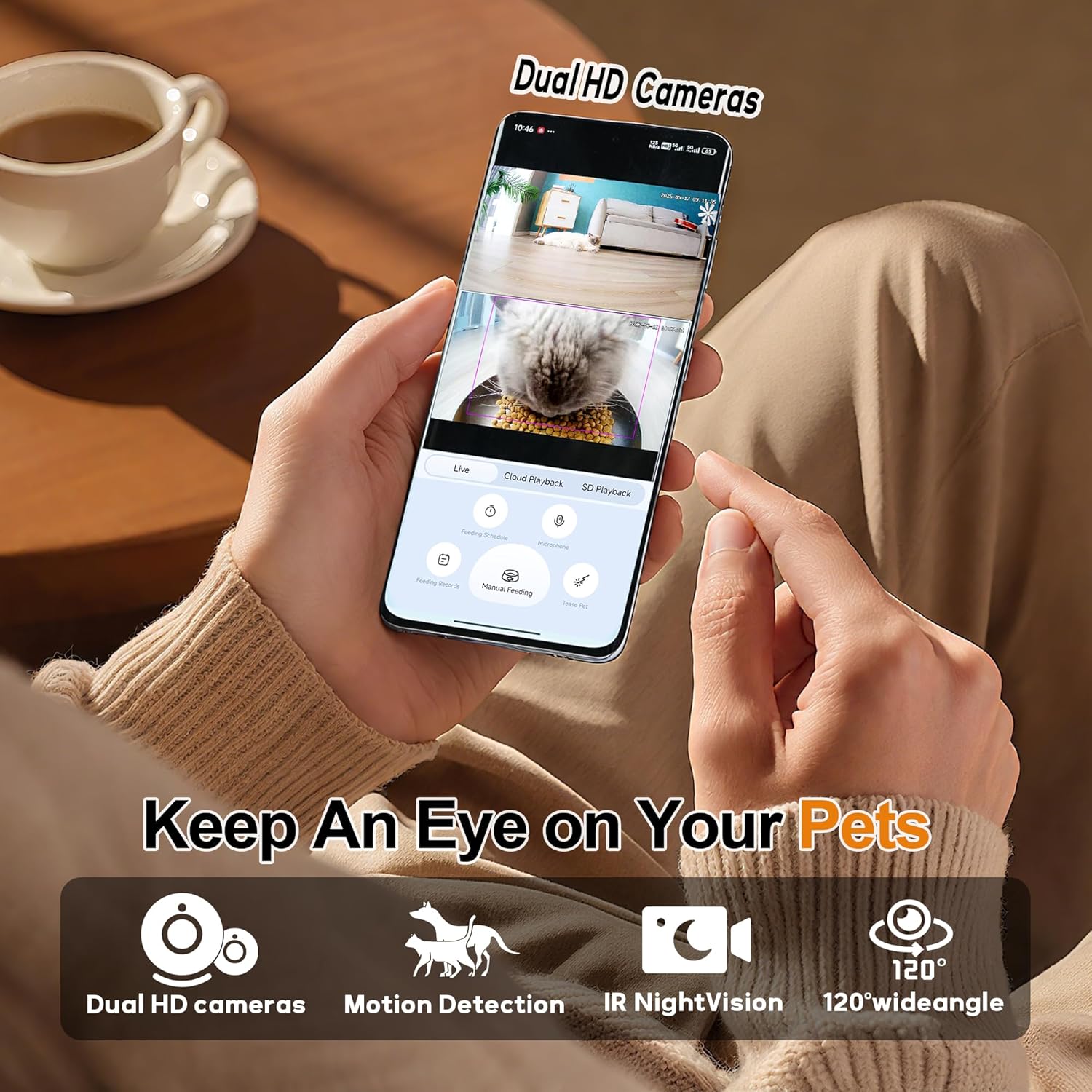 - Special Feature : 1080P HD Rotatable Mobile Dual Cameras, Dual power supply, 6L Big Capacity with Customized Feeding Schedule, 2-Way Audio, Smart Night Vision, Pet Motion Detection,Laser Pointer,BLE 4.0 Bluetooth Quickly Pairing, Supports 2.4G & 5G Wi-Fi Network 1080P HD Rotatable Mobile Dual Cameras, Dual power supply, 6L Big Capacity with Customized Feeding Sch… See more