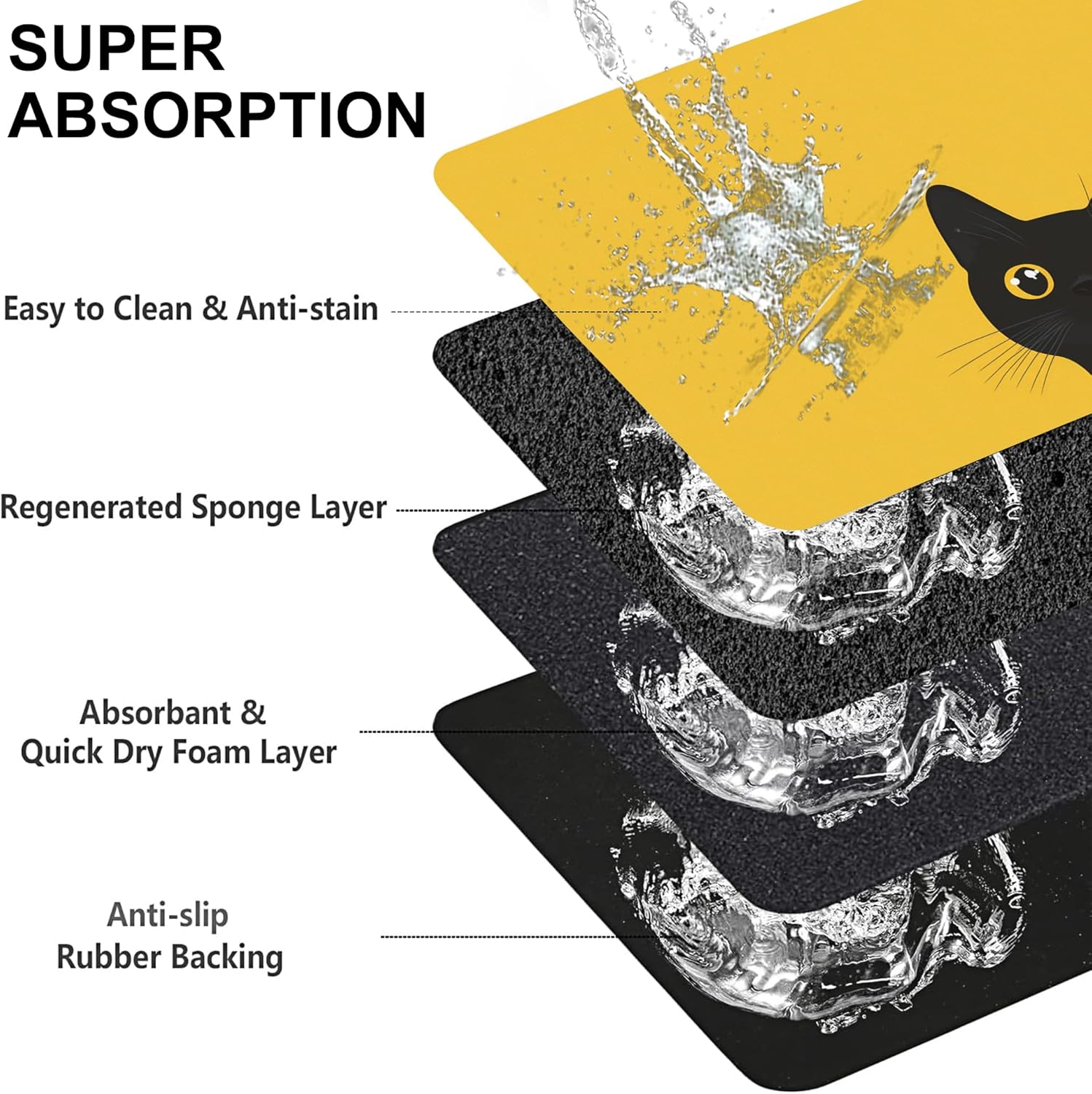 - Super Absorbent & Stain-Resistant:Made with ultra-absorbent fabric, this pet feeding mat quickly soaks up water, milk, or food spills, keeping the area around bowls clean and dry. Say goodbye to wet paw prints and sticky residues—perfect for messy eaters and playful drinkers.