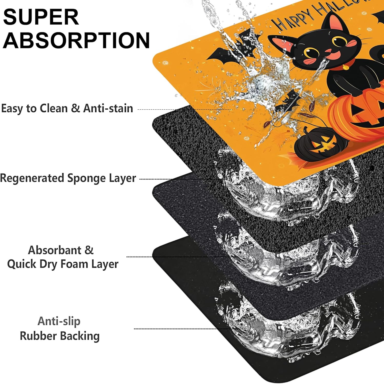 Happy Halloween Cat Pet Feeding Mat for Floors-Absorbent Dog Bowl Mat for Food and Water, Quick Dry Pet Cat Feeding Mats with Non Slip Bottom, Mess-Free Dog Accessories 16"x24"