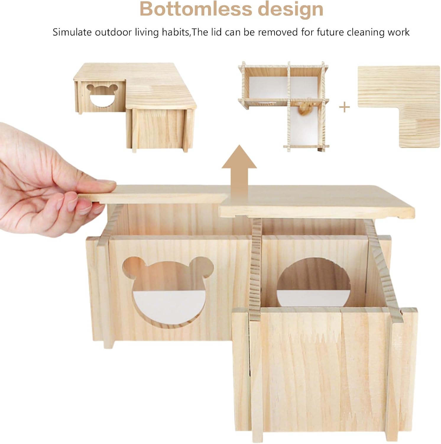 - Wooden Hamster Castle: The hamster hideaway features a double-layer structure design and 2 independent hamster hides. It also allows you to flexibly adjust the layout according to personal preferences or pet need, increasing the diversity and enrichment.This gerbil house is made of natural wood and has no peculiar smell. Every corner is polished smoothly to avoid scratching pets. It brings a chew able and safe hamster hut for syrian hamsters.