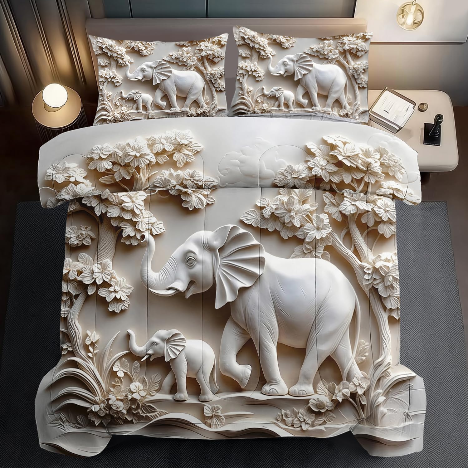 Elephant Comforter Set King Adult, White Animal Bedding Set King for Man, Cute Animal Comforter for Kids,Elephant Quilt Pattern White Bedroom Decor Womens, Relief Bedding