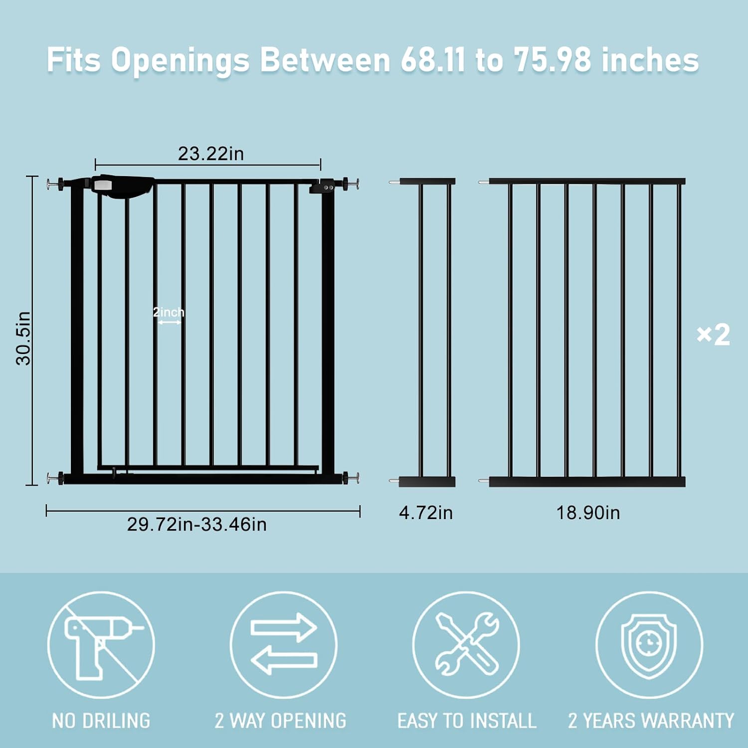 WAOWAO Triple Lock 68.11-75.98" Baby Gate Extra Wide Pressure Mounted Walk Through Swing Auto Close Safety Black Metal Dog Pet Puppy for Stairs,Doorways,Kitchen