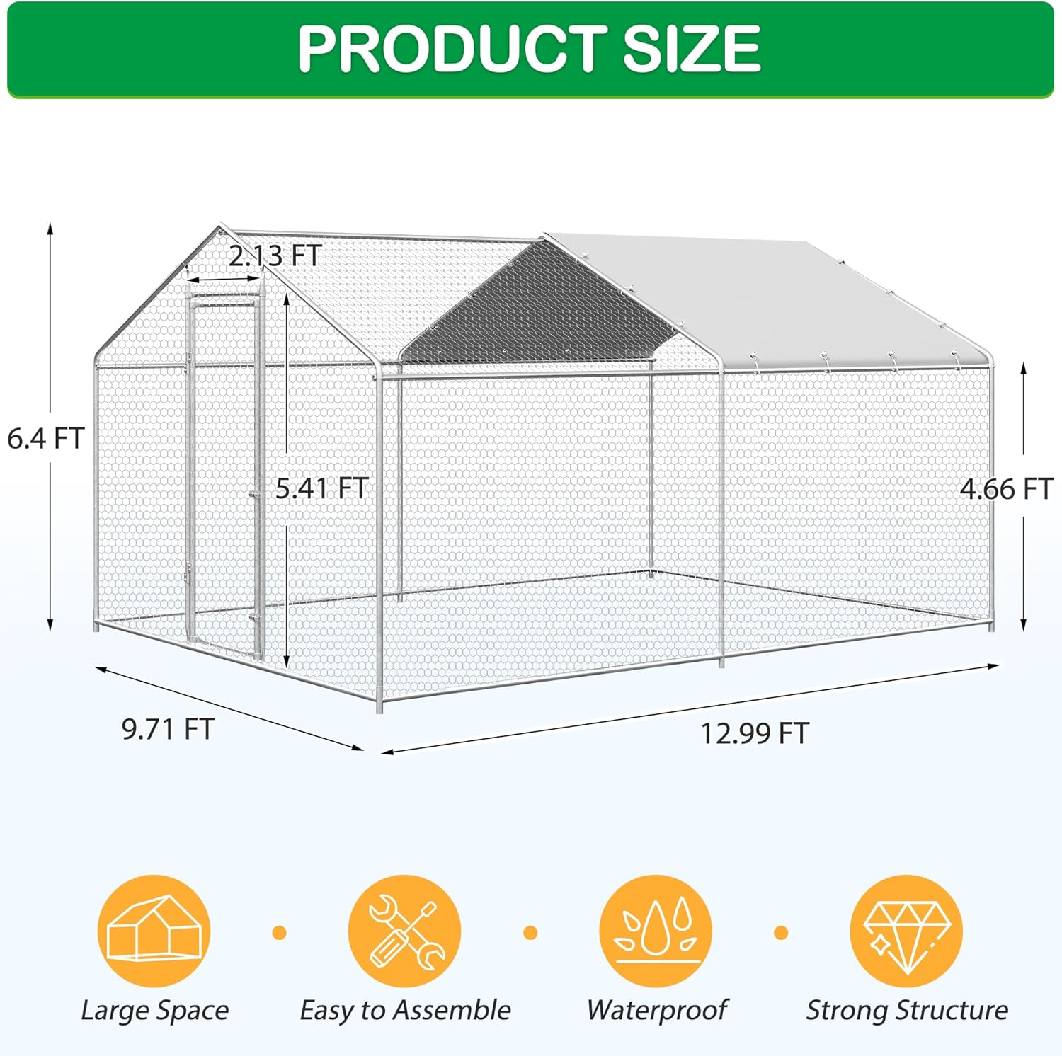 Large Metal Chicken Coop, Walk-in Chicken Run Pen with Waterproof Cover, Spire Roof Poultry Cage Run for Outdoors, Backyard, Farm(9.7'Wx12.99'Lx6.4'H)