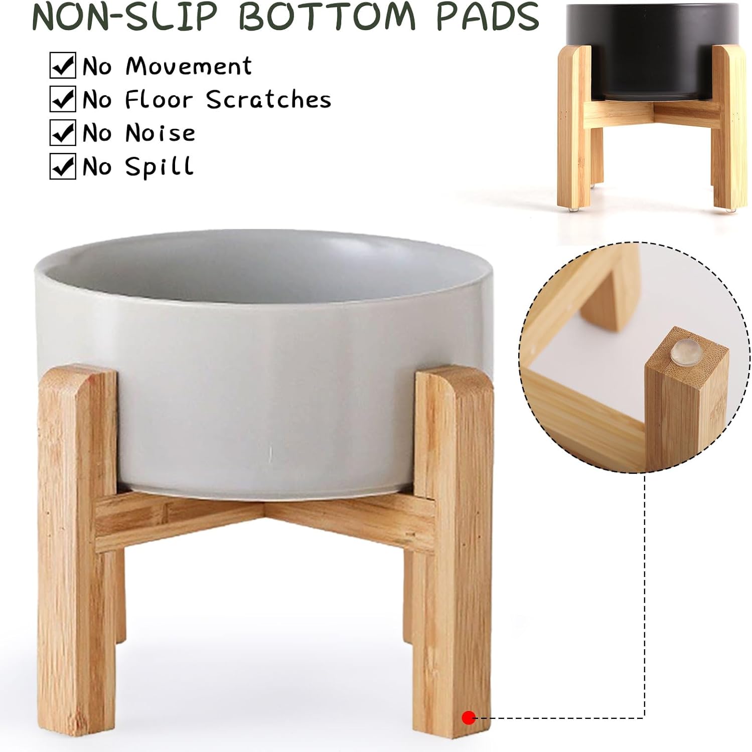 - NON SLIP WOOD STAND -You can get two different heights by flipping the bamboo stand,the elevated ceramic large size pet bowls are perfect for small and medium dogs from different stages of childhood to adulthood, The wood stand on the bowls stopping ceramic dog bowl from sliding around, Keeps pet food and water in the bowls.
