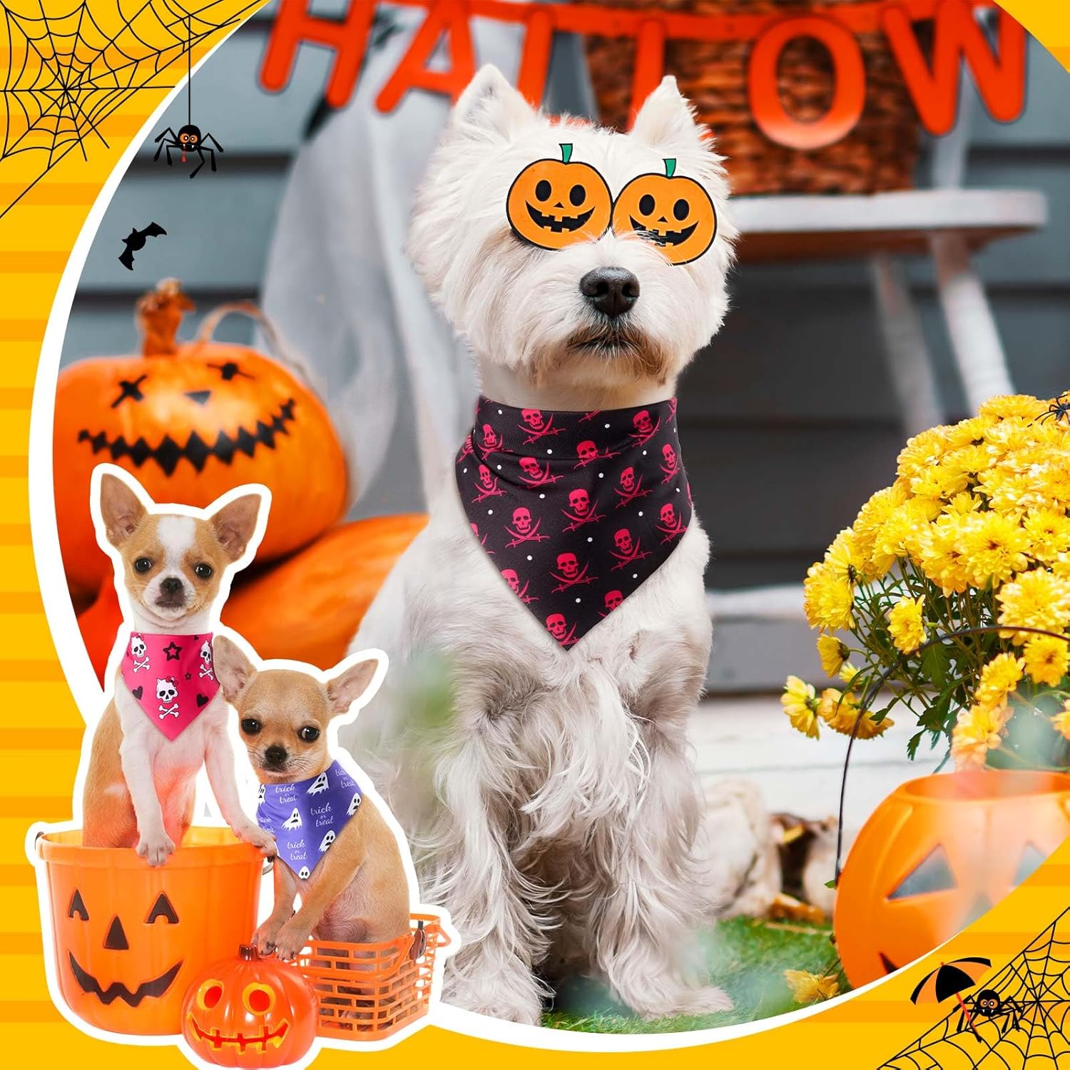 - Halloween Dog Bandanas Bulk: This bulk set includes 120 Halloween dog bandanas in 40 different styles, 3 pieces each, giving you plenty of variety for everyday wear, holiday photos, or party costumes. Share them with friends, shelters, or use as festive pet gifts