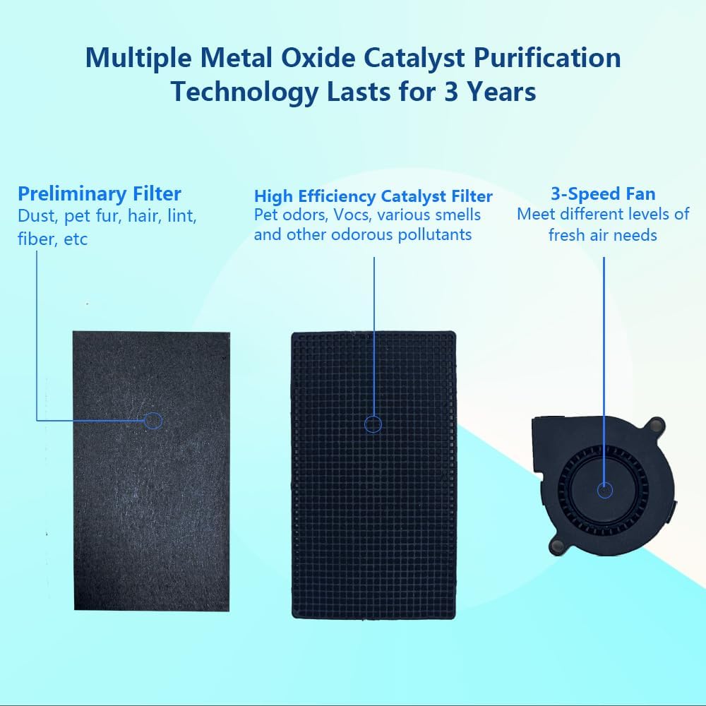 - Lasting for 3 Years: The cat litter deodorizer uses a high-efficiency catalyst activated carbon block filter with a service life of 3 years, which can remove odors from bathrooms, kitchens, pet rooms, basements and more.