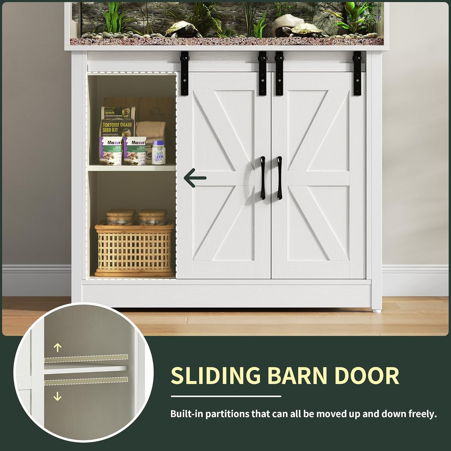 - Multifunctional Storage Stand - Equipped with dual barn-style side compartments and a double-shelf center section, this stand lets you neatly store UVB lights, heating pads, hygrometers, treats, and bedding. It’s a practical and visually appealing reptile tank stand / terrarium stand that helps you maintain a clutter-free and systemized reptile care space.