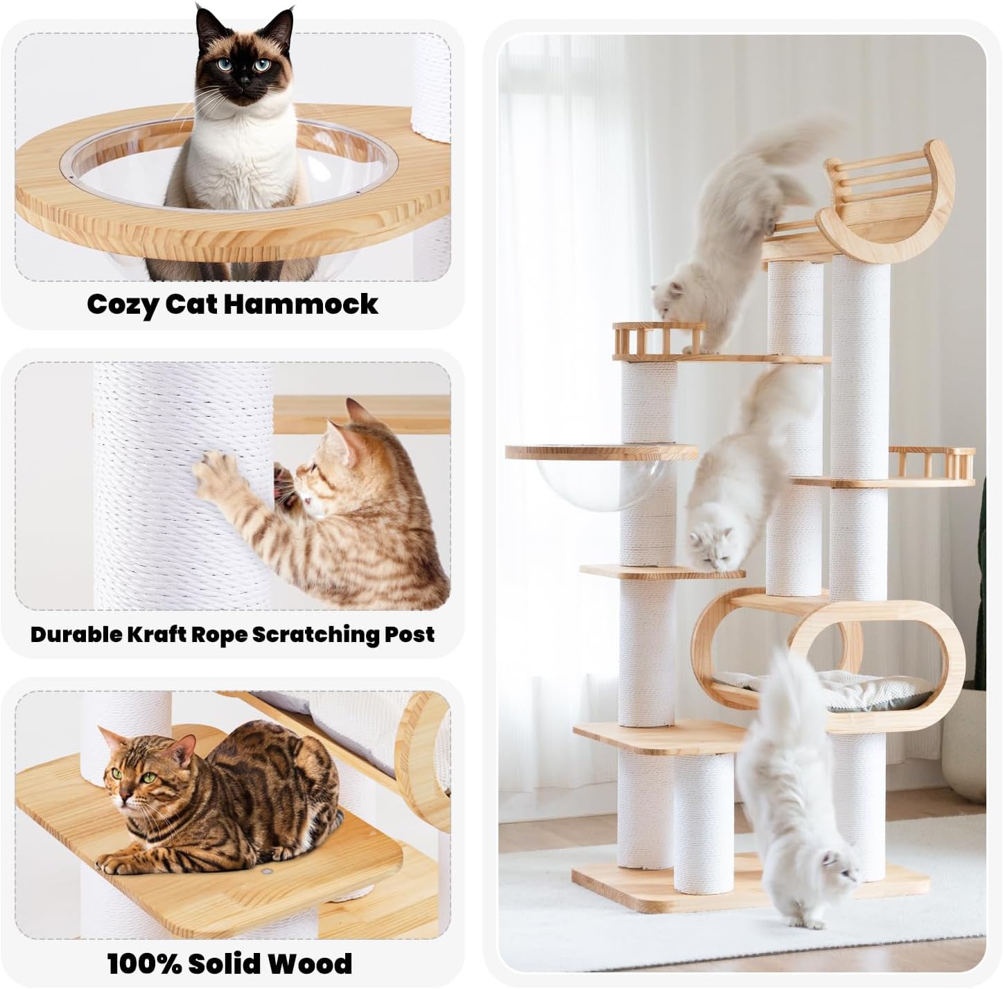 - 【Pet-friendly Material】Our cat tree crafted from superior 100% pine wood with thick base that combines luxury with stability, offering tactile pleasure and durability for your kitten. The top platform features a protection bar that reduces injury risk by preventing falls.This cat furniture is designed to offer a safe, sturdy and entertaining home for your kittens.