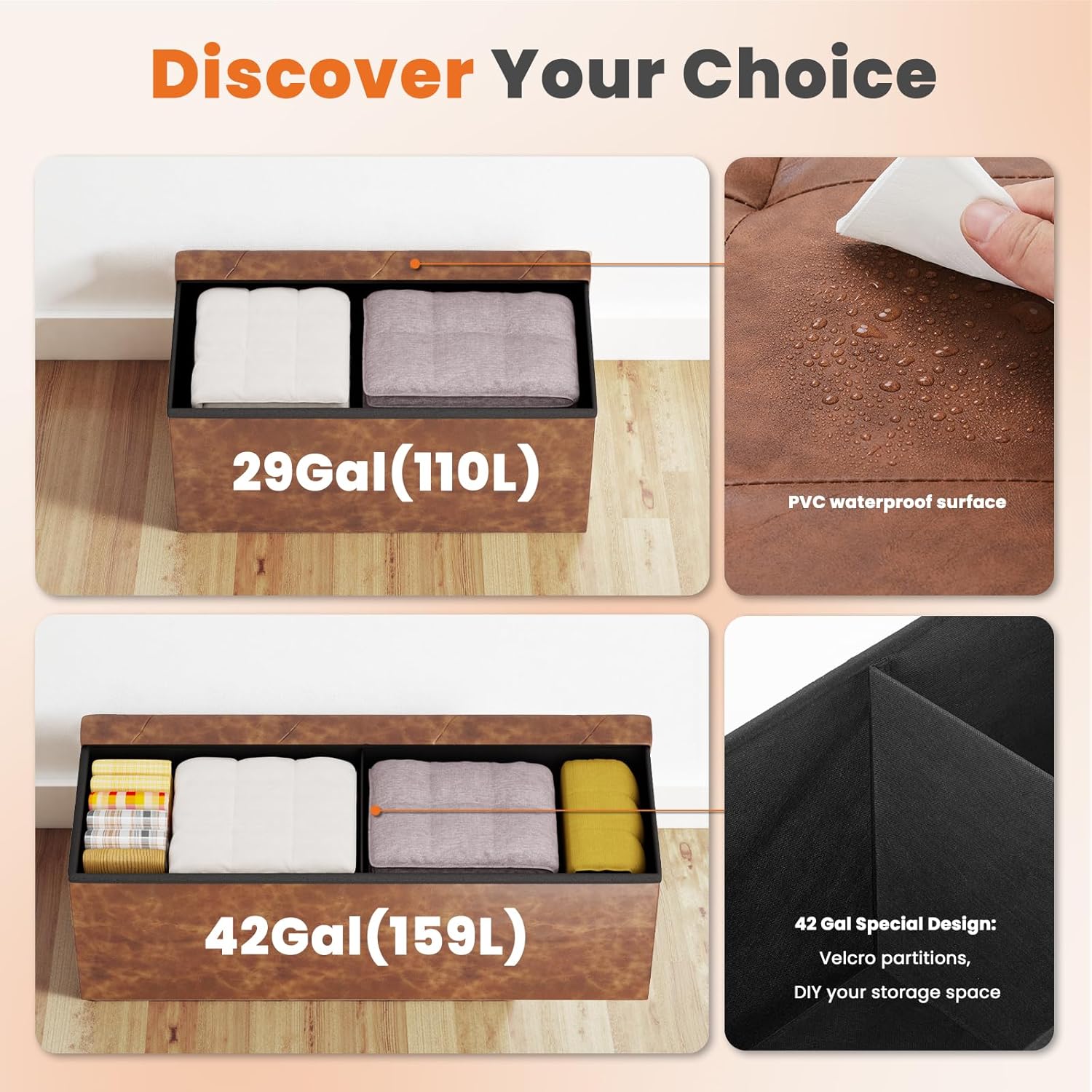 - 【Massive Storage (Way Bigger Than Most!)】Tired of tiny storage bins? Sweetcrispy’s got you:Small: 29 Gal (110L)/Large: 42 Gal (159L)—includes a Velcro divider to organize shoes, toys, or blankets!Just unfold, pop in the base, and fill ’er up. Hello, tidy space!