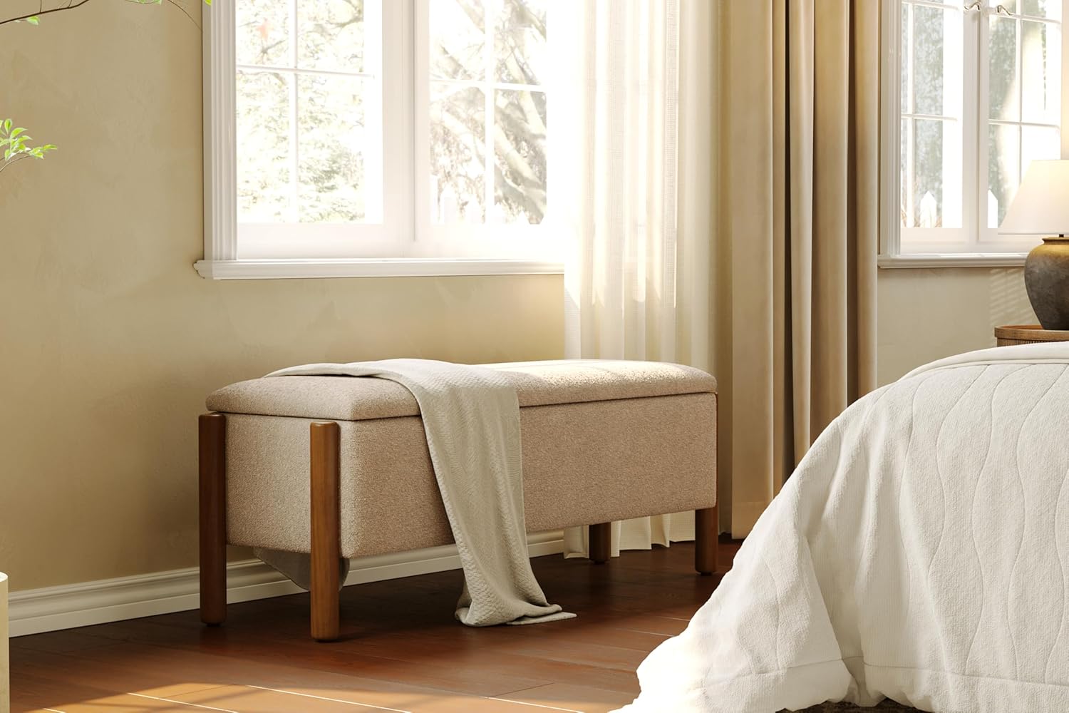 - ELEGANT & TIMELESS DESIGN: Elevate your space with this stylish Storage Bench featuring genuine walnut wood-grain legs and plush 5.5cm cushioned seating. Wrapped in skin-friendly loop yarn fabric, this chic Ottoman Bench seamlessly enhances bedroom, end of bed, entryway, or livingroom decor while offering lasting comfort.