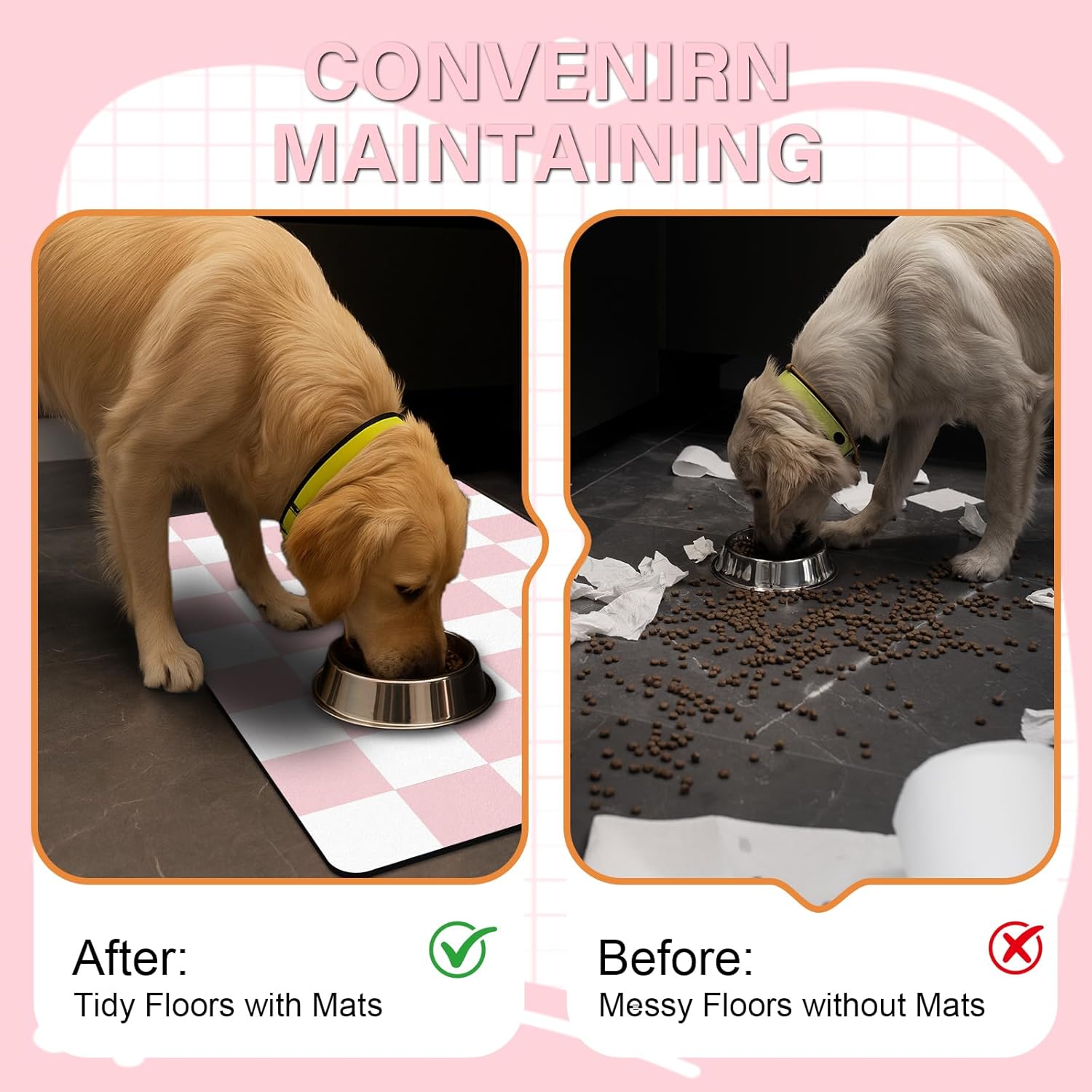 Cat Food Mat - 12"x 20" Cat Dog Mats for Food and Water Bowl, Checkered Pet Placemat Feeding Mat, Non-Slip Under Pet Bowls Mats for Messy Drinkers, Pink & White