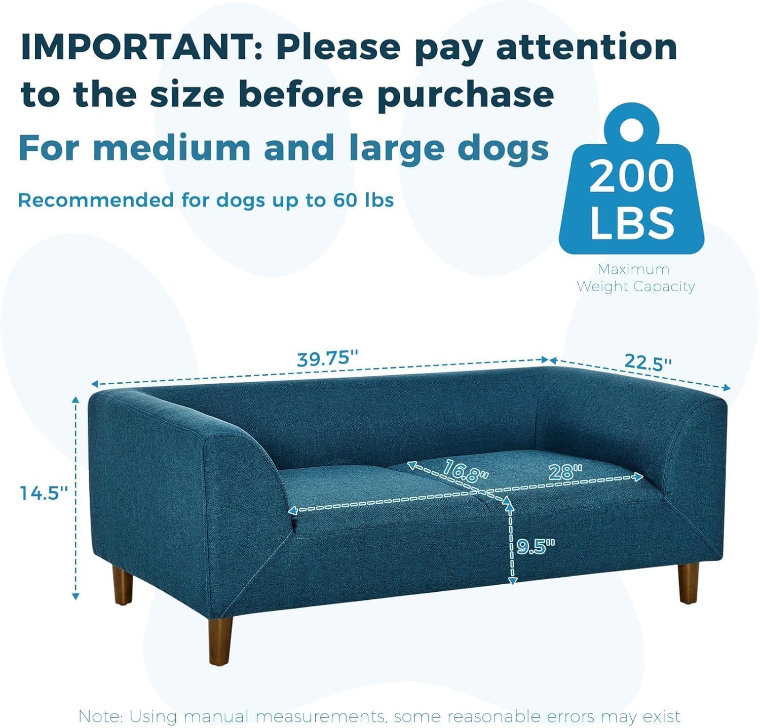 - Warm tips: The size of the dog couch is 39.5" * 22.5" * 14.5". Cushion size: 16.8" D * 28" W. Maximum weight capacity is 200 lbs. Suitable for medium and large dogs, not suitable for extra large dogs. Please pay attention to the size of the product before shopping!!!!