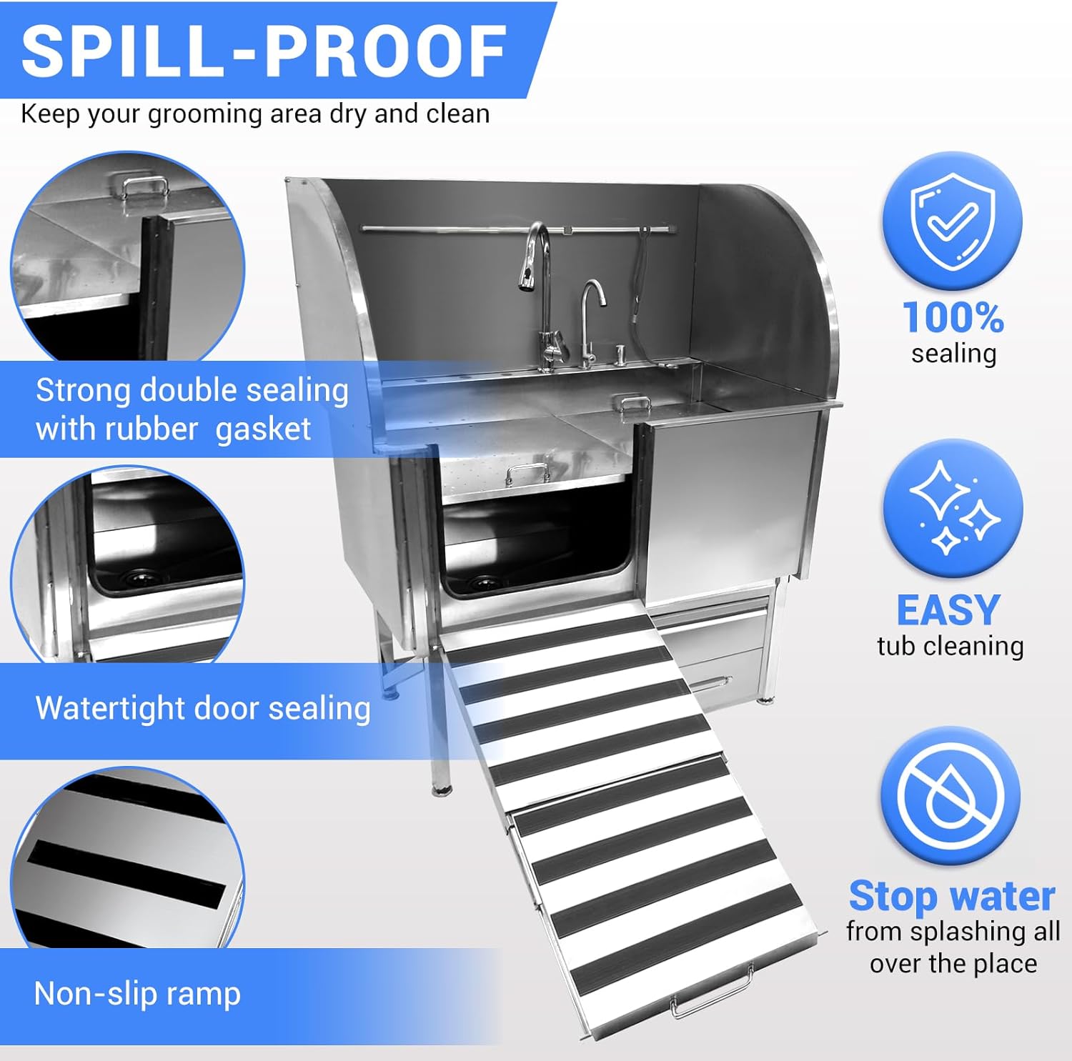 - Spacious Tub with Smart Storage: 62”x30.7”x58.7” size fits all dog breeds. Includes a large sliding drawer to organize towels, shampoos, and grooming tools for a clutter-free bathing area.