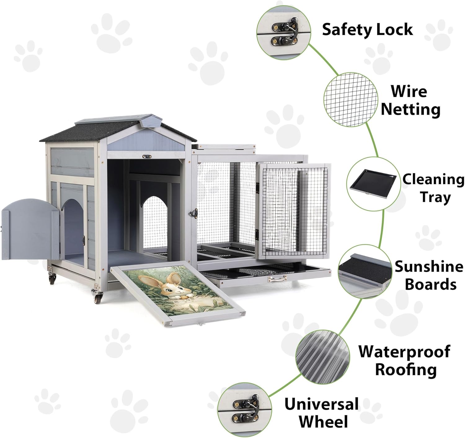 - Cleaning Trays:The bottom of the bunny hutch indoor comes with a cleaning tray made of PVC, which can be easily pulled out by the handle, making it easy for you to clean up the animal's faeces and ensure a clean and tidy environment inside the pet cage