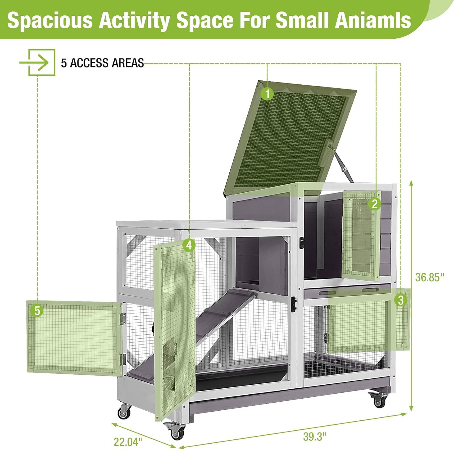 - Cozy Home for Pets: Our 2-story hutch, sized at 39.37’’L*22.04’’W*36.8’’H, is a spacious sanctuary for your small animals like guinea pigs, rabbits, or chicks, offering them a comfortable and secure place to play and rest