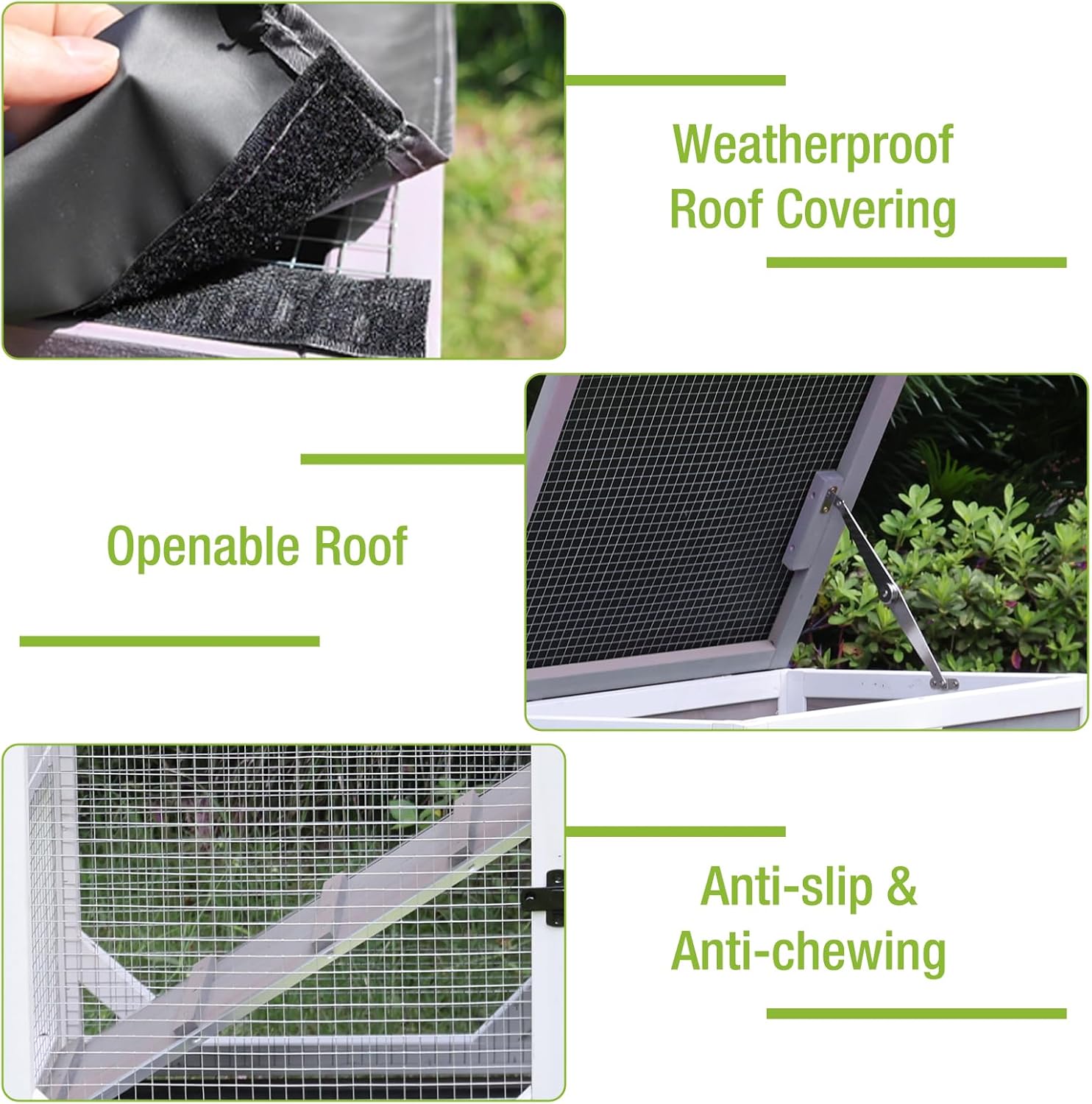 - Indoor and Outdoor: The openable roof allows for easy feeding and interaction. Plus, the waterproof covering shields your pet from the weather and offers shade, making this hutch perfect for both indoor and outdoor use