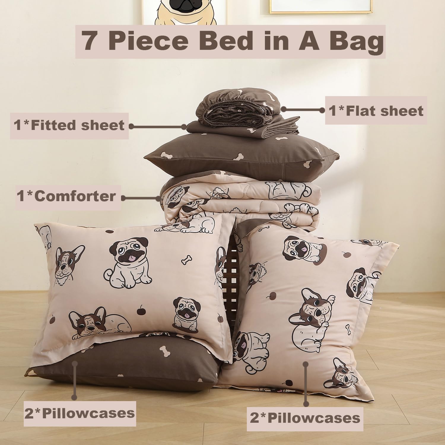 - 7 Piece Kids Comforter Set Included : 1 dog Twin comforter 68 inch x 86 inch + 2 standard pillowcases 20 inch x 26 inch - 1 twin size fitted sheet 39 inch x 75 inch - 1 twin size flat sheet 66 inch x 96 inch - 2 standard pillowcase 20 inch x 26 inch.
