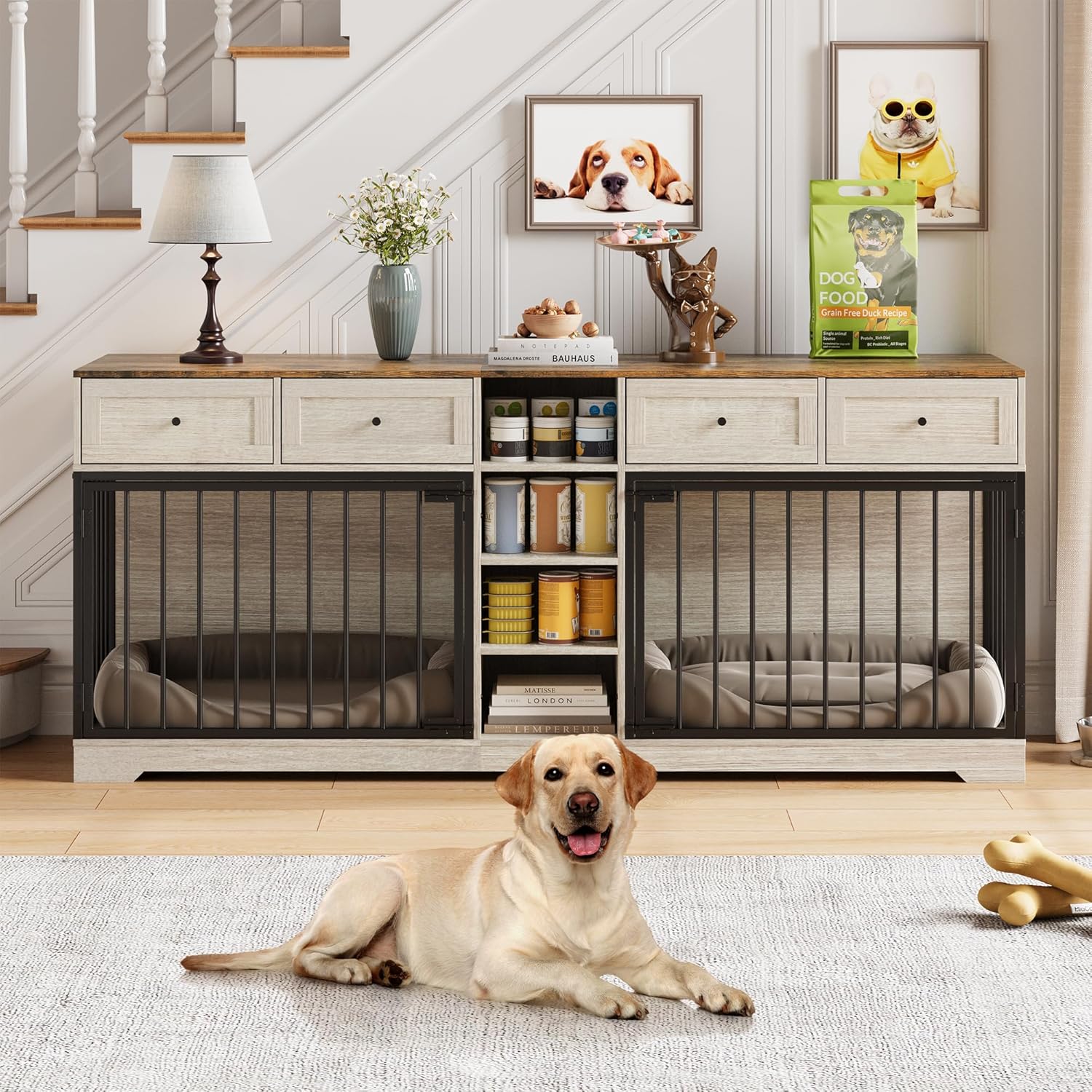 - Multi-functional Storage Options - This double dog crate with 2 large storage drawers to keep your pet's toys, clothes and other items neatly organized, 4 adjustable open storage compartments for storing dog food and other bulky items at will, a variety of storage methods to solve all your storage problems. The top surface provides ample space for placing decorations or items, dding a practical touch to its classic and simple design.