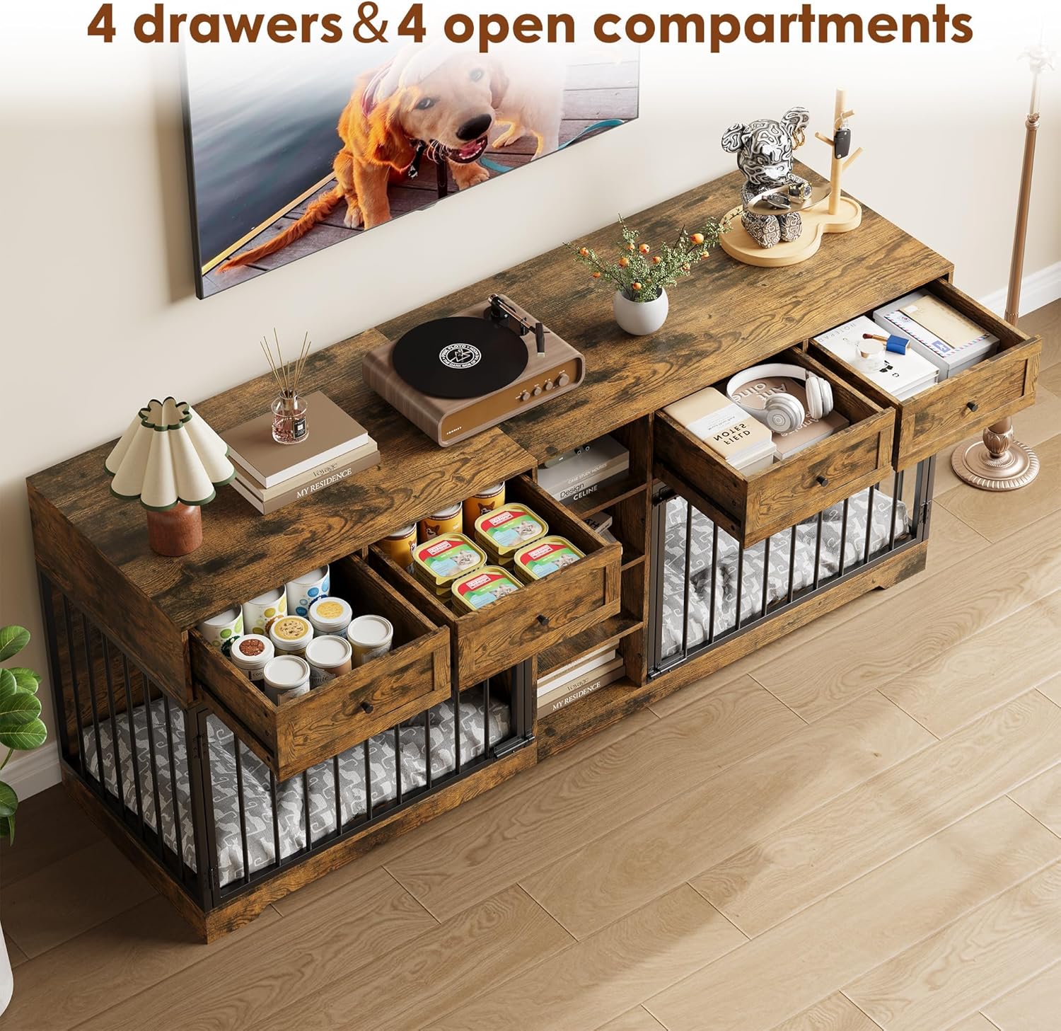 - Multi-functional Storage Options - This double dog crate with 2 large storage drawers to keep your pet's toys, clothes and other items neatly organized, 4 adjustable open storage compartments for storing dog food and other bulky items at will, a variety of storage methods to solve all your storage problems. The top surface provides ample space for placing decorations or items, dding a practical touch to its classic and simple design.